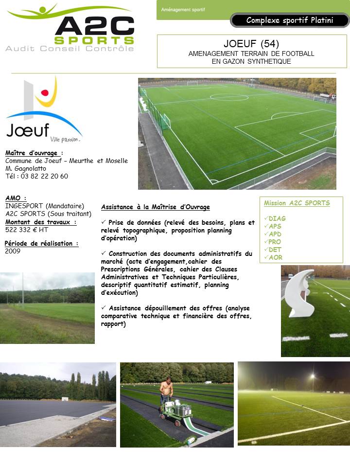 Enfants de Joeuf, la famille PLATINI a donné son nom à l’ancien complexe des Ravennes. Après un terrain hat-trick réalisé en 2008, un terrain synthétique -105m x 68m est venu compléter cet équipement. Les enjeux étaient de taille (problèmes d’infrastructure et de délai). A2C SPORTS en collaboration avec INGESPORT, ont relevé le défi (grâce à une proposition de site pertinente et à un nouveau concept d’infrastructure s’adaptant à la configuration difficile du terrain initial et permettant la mise en jeu du terrain deux mois et demi après le démarrage des travaux.